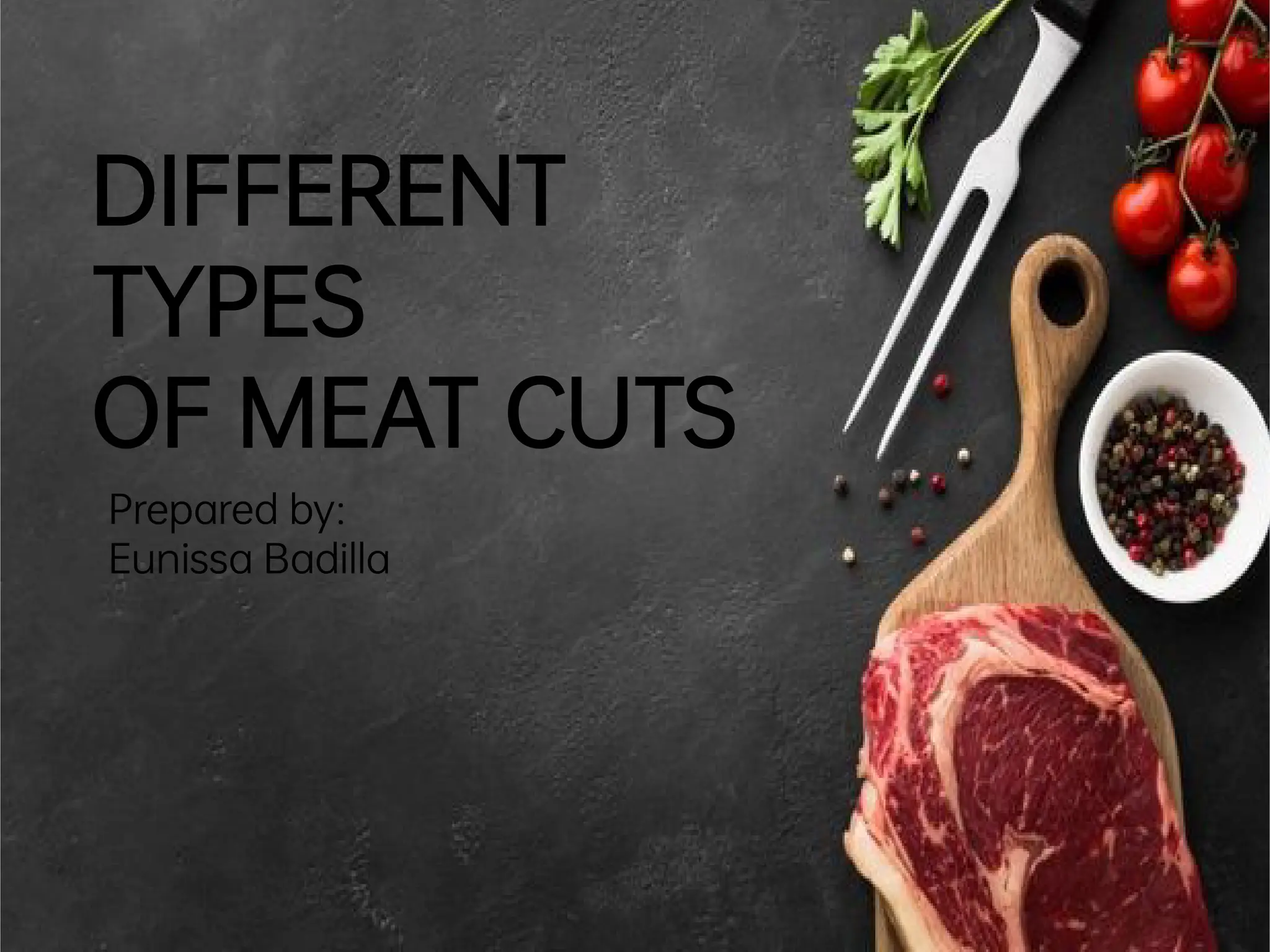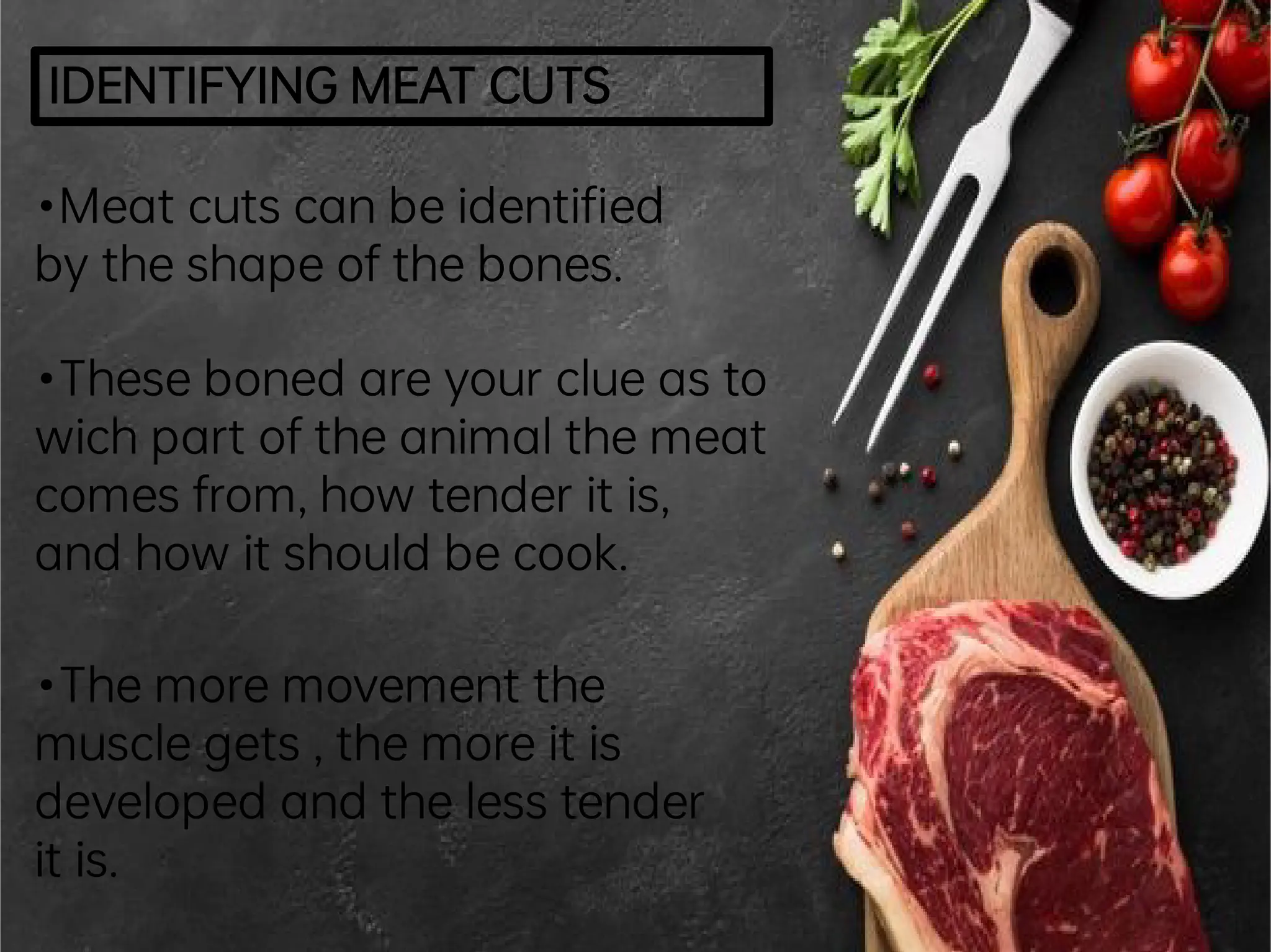 The document outlines different types of meat cuts classified by the tenderness based on muscle movement. It distinguishes between tender cuts (e.g., sirloin, porterhouse, tenderloin), less tender cuts (e.g., chuck, flank, neck), and tough cuts (e.g., blade, brisket, shortrib), explaining their origins and cooking recommendations. Each type of meat cut is associated with specific parts of the animal and their respective cooking methods based on their tenderness.