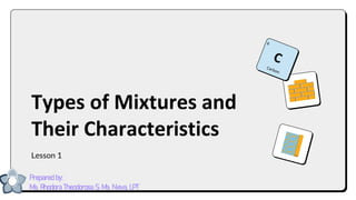 This document discusses different types of mixtures and their characteristics. It defines a mixture as a physical combination of substances that retain their individual properties. Mixtures are categorized as either homogeneous or heterogeneous. Homogeneous mixtures like solutions are uniform mixtures where particles cannot be seen, while heterogeneous mixtures like suspensions and colloids have particles that can be seen and are suspended in another substance. The document provides examples and details on the components, properties, and types of various mixtures.