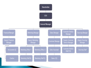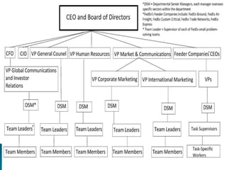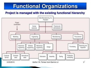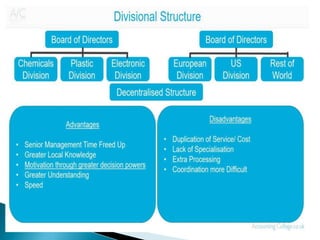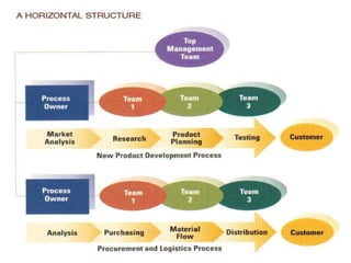 The document discusses different types of organizational structures and how they allocate power and responsibilities. A vertical organization has a clear top-down chain of command, while a horizontal organization distributes power more equally across levels. A functional structure groups employees by specialized roles, making it one of the most common structures. A divisional structure separates a company into independent divisions based on product, customer or geography. A matrix structure combines functional and divisional approaches to allow for dual reporting relationships.