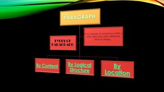 This document discusses different types of paragraphs based on their content, logical structure, and location. It identifies argumentative, definition, chronological, enumerative, descriptive, explicative, expository, and narrative paragraphs based on their content. Based on logical structure, it discusses comparison, cause-effect, approach and problem solving, sequence or process, deductive, and inductive paragraphs. Finally, it identifies opening, transition, and closing paragraphs based on their location within a text.