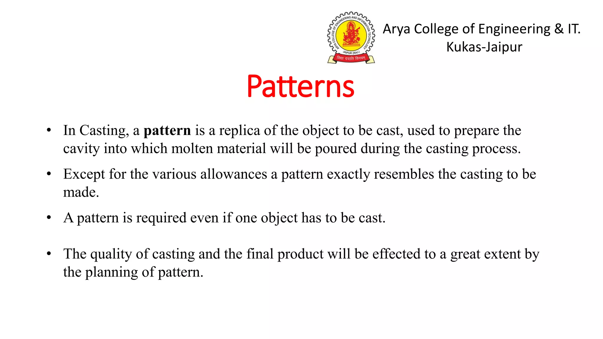 The document discusses different types of patterns used in casting processes. It describes that a pattern is a replica of the object being cast and influences casting quality. The main types discussed are one-piece, split, loose-piece, match plate, sweep, gated, and skeleton patterns. Each type has advantages for different casting sizes, quantities, or shapes. A pattern prepares the mold cavity and may include cores, runners and gates. Properly made patterns reduce defects and costs.