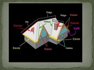 The document outlines various types of pitched roofs, detailing their basic elements such as lean-to, gable, hip, and mansard roofs, along with their suitability for different spans. It elaborates on single, double, and trussed roof types, including key components like rafters, purlins, and trusses, as well as reinforcing methods to prevent sagging and spreading. Additionally, it discusses the differences between timber and steel trusses, emphasizing the advantages of steel for longer spans due to its strength and economical fabrication.
