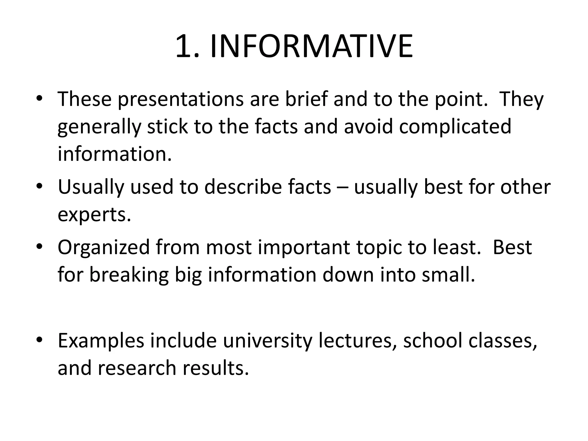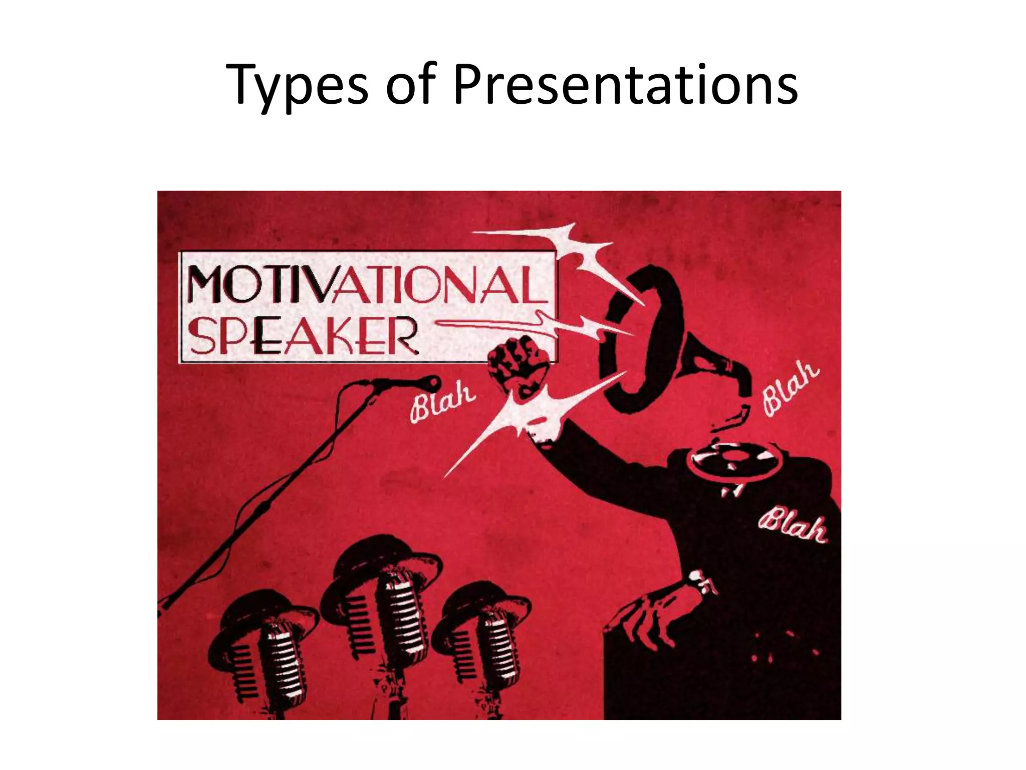 The document outlines 5 types of presentations: informative, instructional, arousing, persuasive, and decision-making. Informative presentations stick to facts and break information down simply. Instructional presentations teach new skills or processes thoroughly. Arousing presentations use stories and examples to engage emotions and interest. Persuasive presentations aim to gain agreement by presenting problems and solutions credibly. Decision-making presentations provide evidence to convince an audience to take a proposed action.