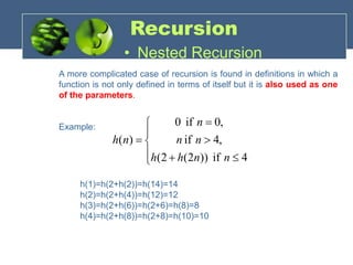 The document discusses recursion and provides examples of recursion including nested recursion. It explains recursion using functions like the Ackermann function and Fibonacci numbers. It discusses excessive recursion and how it can lead to many repeated computations. The document also covers backtracking as a method for systematically trying sequences of decisions to find a solution. It provides the example of solving the eight queens problem using backtracking and recursion.