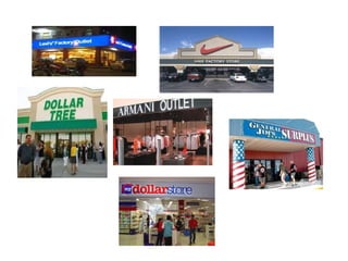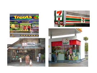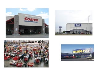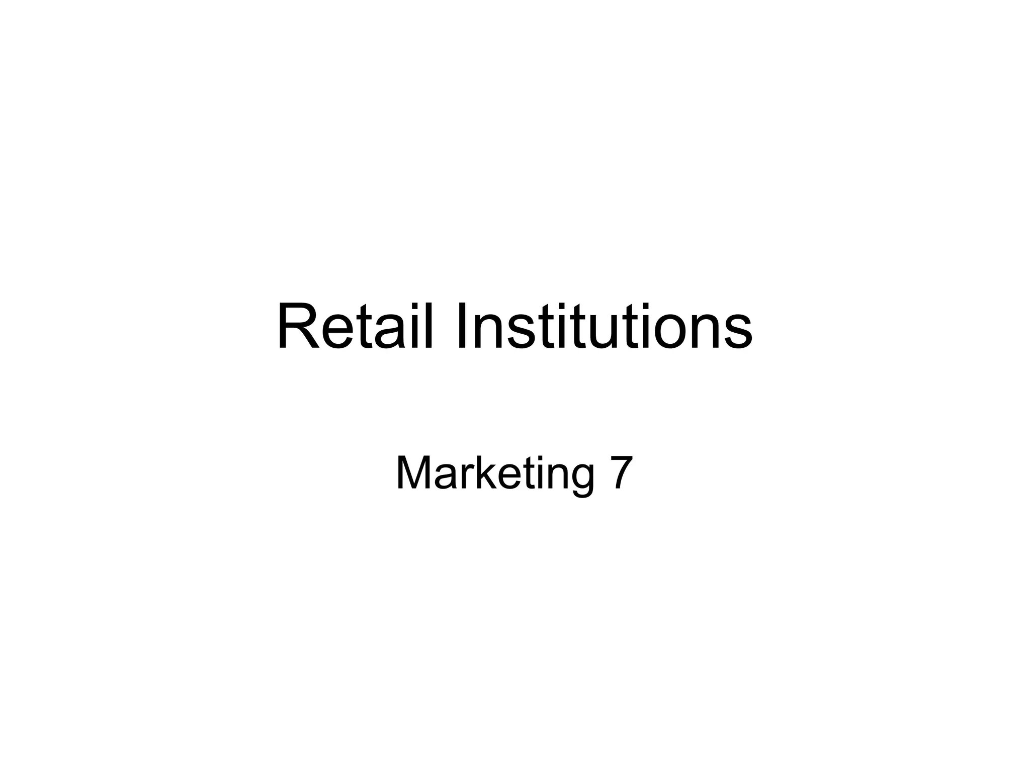 This document discusses different types of retail institutions and ownership structures, including independent retailers, chain stores, and franchises. It then covers various types of retailing like food retailers, general merchandise retailers, non-store retailers, and service retailing. Food retailers discussed include conventional supermarkets, superstores, supercenters, warehouse supermarkets, and convenience stores. General merchandise retailers mentioned are department stores, discount stores, specialty stores, category specialists/killers, home improvement centers, and warehouse clubs. The document also touches on non-store retailing like catalogue, direct mail, direct sell, TV home shopping, and vending machines.