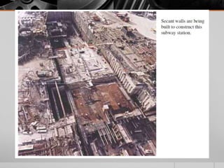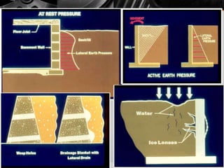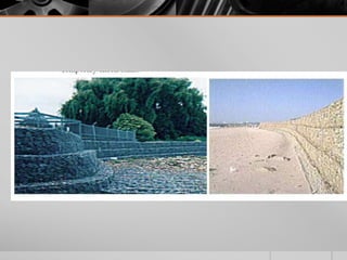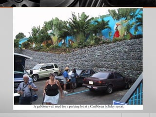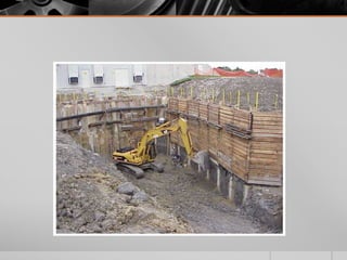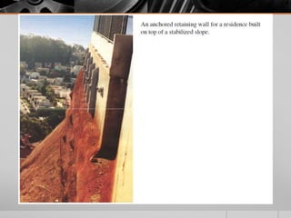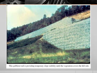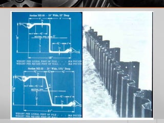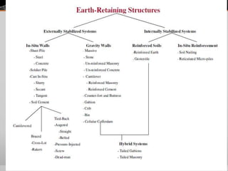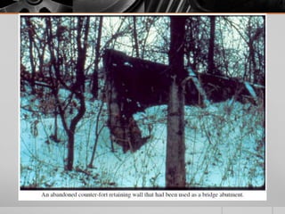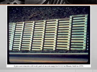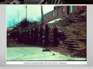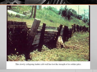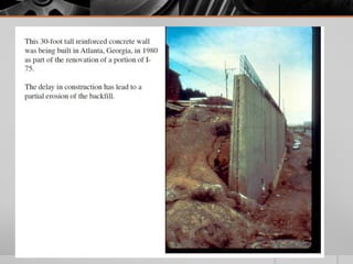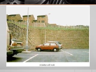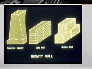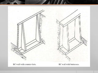 It provides details on the materials, designs, and uses of various retaining wall types. Common materials include wood, steel, concrete, and soil reinforcements. Walls are chosen based on factors like height, site conditions, costs, and whether they are temporary or permanent.