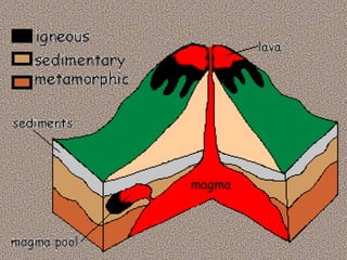 There are three main types of rocks: sedimentary, igneous, and metamorphic. Sedimentary rocks form from compacted and cemented sediments and sometimes contain fossils. Igneous rocks form from cooled magma, with extrusive rocks cooling above ground quickly and intrusive rocks cooling below ground slowly. Metamorphic rocks form from other rocks being heated and compressed, creating new rock types with interlocking crystals or foliation.