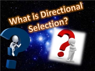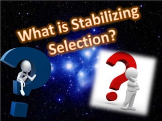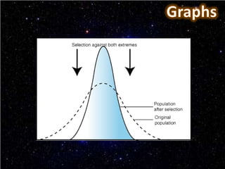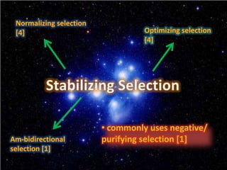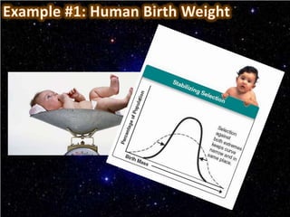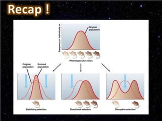 This document discusses the three main types of natural selection: stabilizing selection, directional selection, and disruptive selection. Stabilizing selection preserves existing traits by eliminating extreme variants, directional selection favors individuals with more extreme traits better suited to the environment, and disruptive selection favors intermediate and extreme trait values over median traits. Examples are given for each type of selection, like clam size in disruptive selection.
