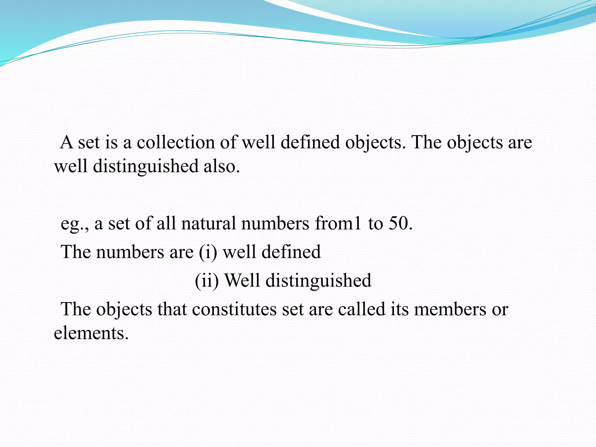 1. A set is a collection of well-defined objects that can be clearly distinguished from one another. Examples of sets include the set of natural numbers from 1 to 50.