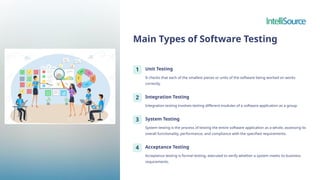 The document outlines various types of software development testing aimed at ensuring quality and reliability throughout the development process. Key testing methods include unit, integration, system, acceptance, performance, security, regression, and usability testing, each serving specific functions to detect issues and improve software performance. It also contrasts automated and manual testing, highlighting the efficiency and comprehensiveness of automation versus the potential subjectivity and human error associated with manual methods.