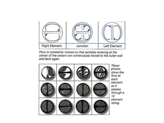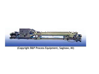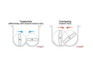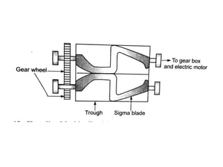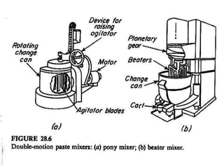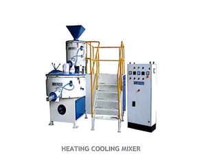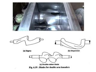 This document summarizes different types of mixers used in industrial processes. It describes static mixers, which mix fluids using inserts in pipes without moving parts, including helical element mixers and turbulent vortex mixers. It also describes intensive mixers like change-can mixers, kneaders including sigma and Banbury mixers, mixer extruders, and muller mixers. Finally, it discusses heating and cooling mixers like high speed mixers and cooling mixers used to precisely control temperature during industrial mixing.
