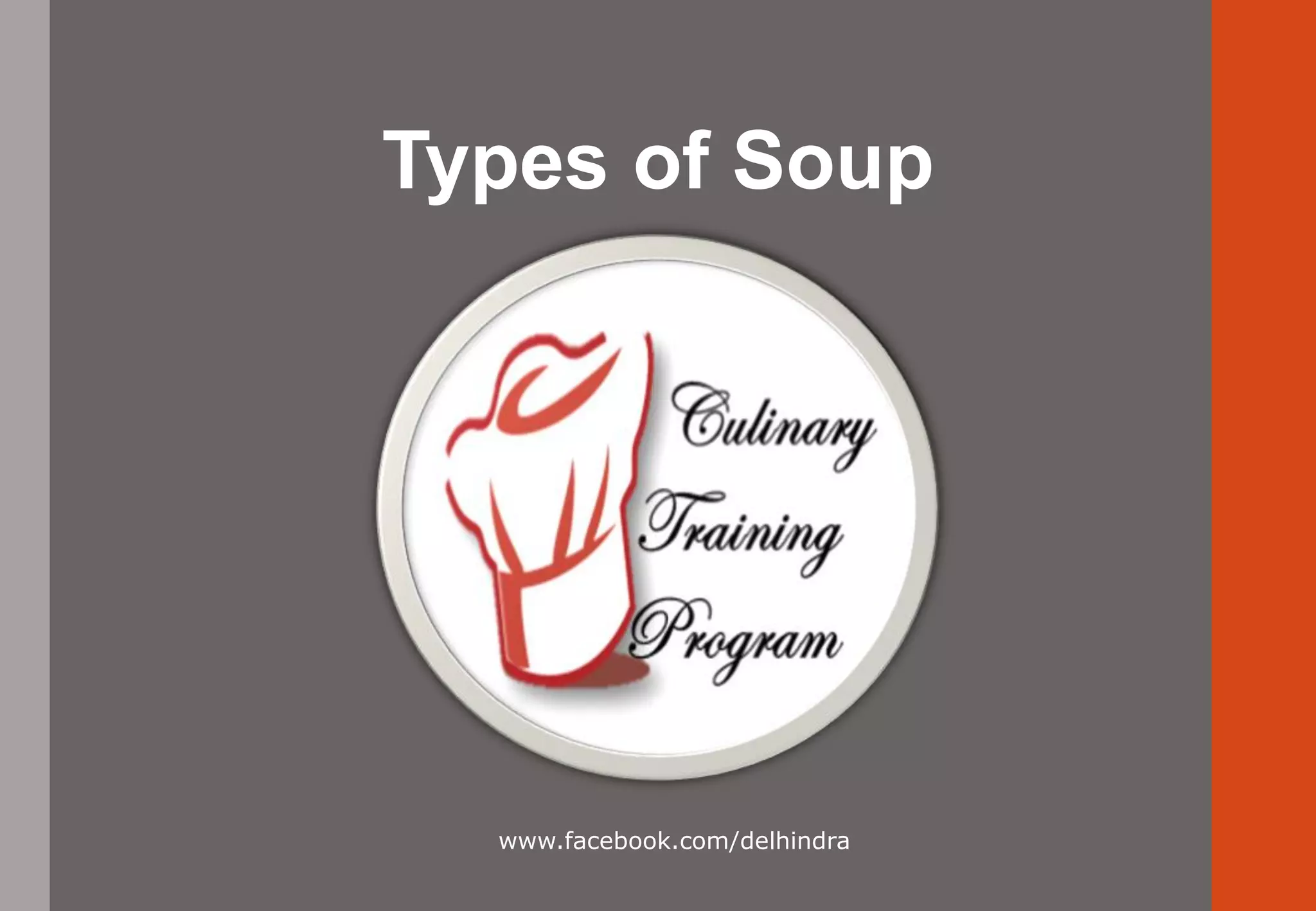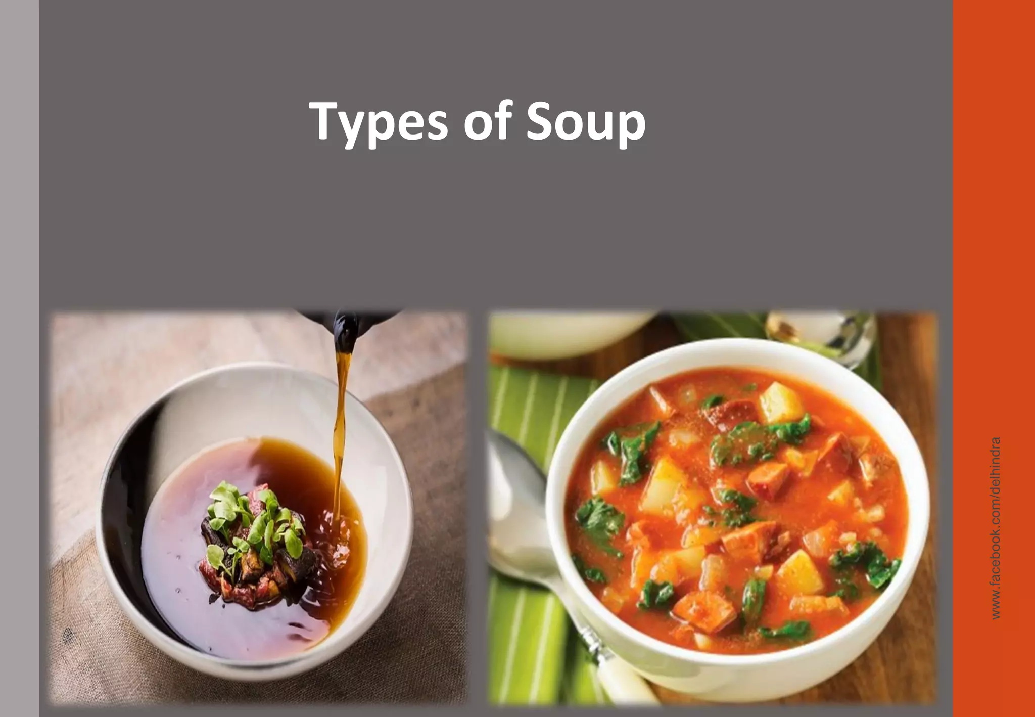 1. The document discusses different types of soups including clear soups, thick soups, cold soups, and specialty/national soups.