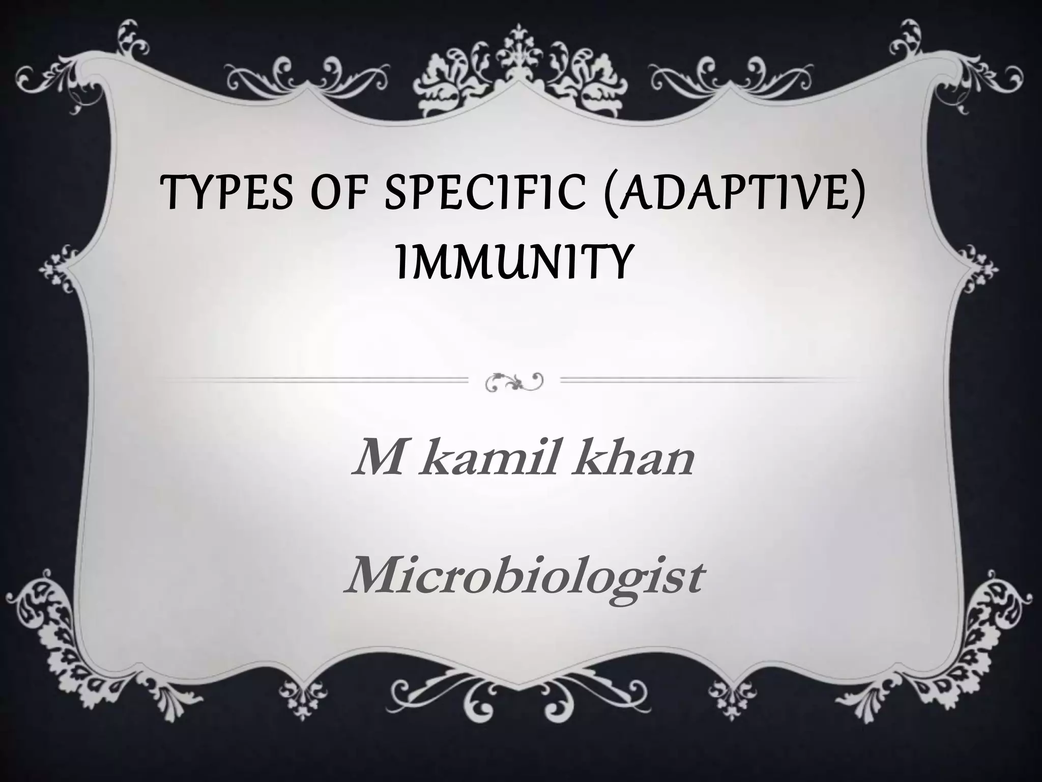 The document discusses types of specific adaptive immunity, highlighting naturally and artificially acquired immunity. Naturally acquired immunity includes active immunity from exposure to pathogens and passive immunity via maternal antibody transfer. Artificially acquired immunity involves intentional exposure to vaccines for active immunity and the introduction of externally produced antibodies for passive immunity.