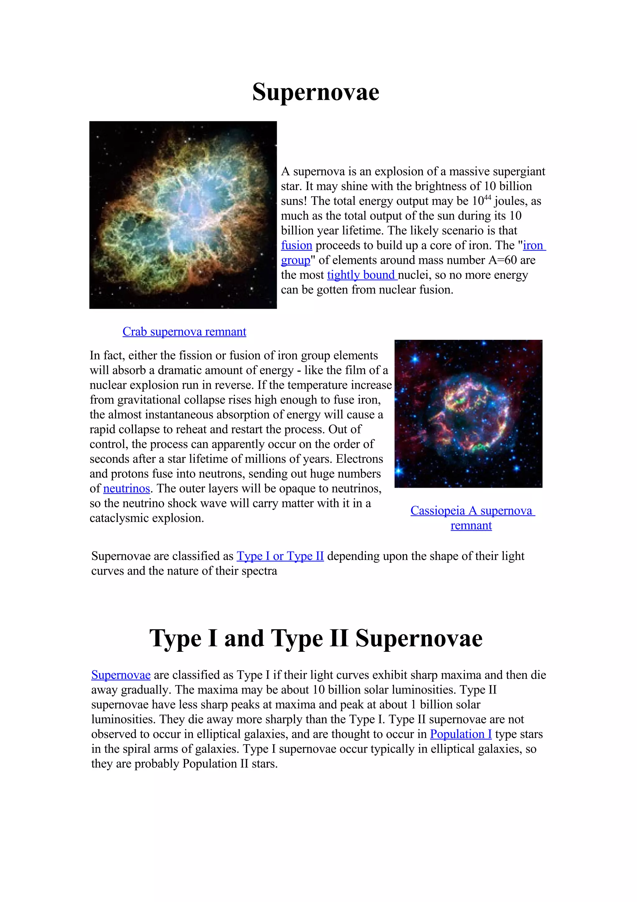 A supernova is an explosion of a massive supergiant star that may shine with the brightness of 10 billion suns. Supernovae are classified as Type I or Type II depending on their light curves and spectra. Type I supernovae exhibit sharp maxima that decay gradually and lack hydrogen, while Type II have less sharp peaks, decay more sharply, and contain hydrogen. Type Ia supernovae, specifically, have become important for measuring cosmological distances due to their reliable peak brightness.