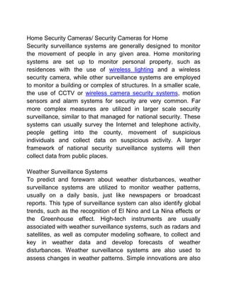 There are several types of surveillance systems that monitor different areas. Security surveillance systems monitor changes within an assigned field using tools like video recordings and data analysis to alert of unwanted events. Health surveillance systems like those used by the WHO and schools monitor disease trends and outbreaks by collecting data from various sources. Home security cameras and sensors are also a type of smaller-scale surveillance system that monitors personal property. Weather surveillance systems use instruments like satellites and sensors to collect weather data and develop forecasts as well as monitor changes in weather patterns.