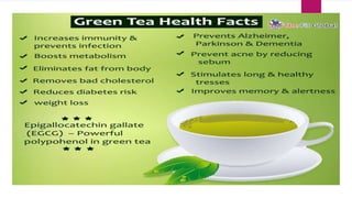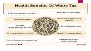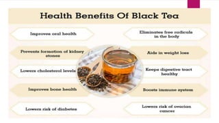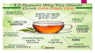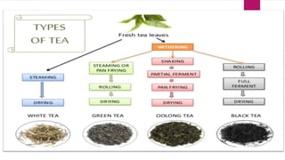 The document outlines various types of tea derived from the Camellia sinensis plant, detailing their classifications based on processing methods such as unfermented white and green tea, semi-fermented oolong tea, and fully fermented black tea. Each type of tea possesses unique characteristics and processing techniques that affect their flavor, antioxidant content, and health benefits. Additionally, the document discusses the impact of instant and flavored teas on quality and health, emphasizing the importance of proper manufacturing methods to retain tea's beneficial properties.
