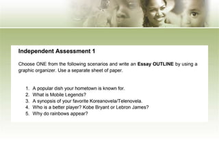The document discusses different types of text structures that can be used in academic writing. It identifies seven main structures: narrative, argumentative, definition, description, classification, comparison/contrast, and problem/solution. For each structure, it provides a brief explanation and example. The overall objectives are to enumerate text structures, extract information from different structures, and employ an appropriate structure in crafting academic texts.
