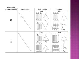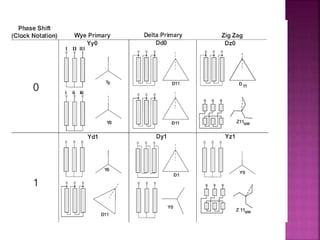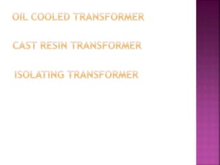 This document discusses different types of transformers. The most common type is a step-down transformer, which is widely used to convert mains voltage to low voltage for powering electronics. It has an insulated lamination core and is available in power ratings ranging from milliwatts to megawatts. Current transformers measure current flowing through their primary coil and provide a proportional current in the secondary coil. Voltage transformers, also called potential transformers, are used for metering and protection in high-voltage circuits, connecting in parallel. Pulse transformers transmit rectangular electrical pulses, optimized for that function. Radio frequency work uses transformers without steel laminations, unsuitable for those frequencies.