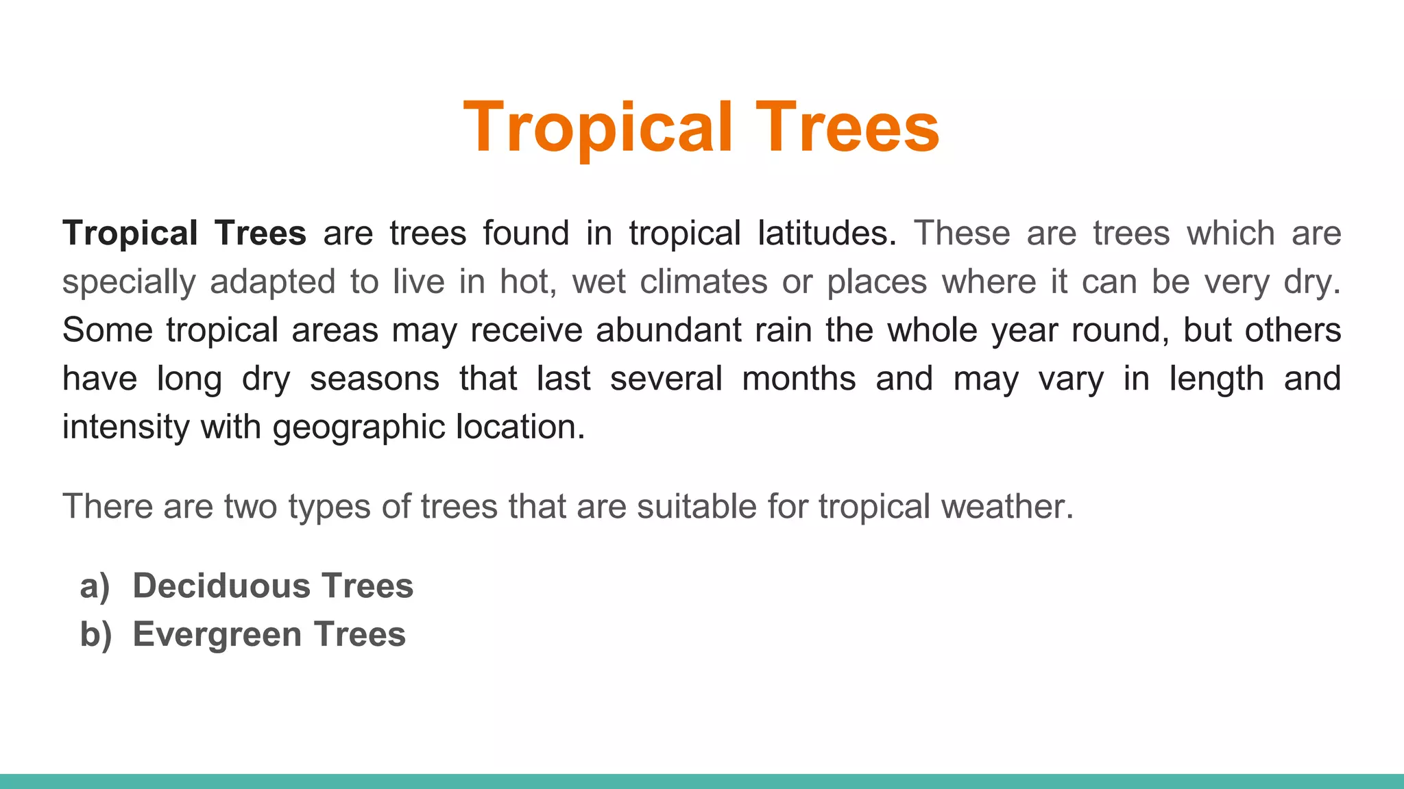 There are two types of trees suitable for tropical weather: deciduous trees and evergreen trees. Deciduous trees drop their broad, flat leaves during the dry season as a means of survival, while evergreen trees retain their needles or leaves year-round. Examples of deciduous trees include oak and maple, while examples of evergreen trees include eucalyptus and neem.
