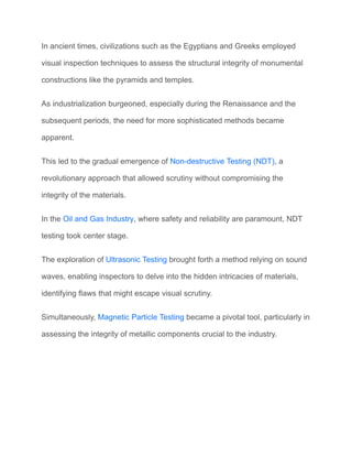 The document provides a comprehensive overview of visual inspection techniques, their historical evolution, and the methodologies used in non-destructive testing (NDT). It details various types of visual inspection, including direct visual, microscopic, magnetic particle, and liquid penetrant inspections, highlighting their applications and industry standards such as ASNT SNT-TC-1A and ISO 9712. Additionally, the document explores the innovative use of drones in visual inspections, enhancing accessibility and efficiency, while emphasizing the significance of these methods in ensuring safety and quality in engineering.