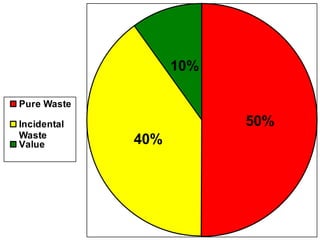 The document discusses the concept of waste in processes, emphasizing the eight types of waste, which include overproduction, inventory, transportation, motion, processing, defects, waiting, and people's skills. It explains that waste adds costs and time without contributing value, and outlines methods to identify and eliminate waste using lean tools and employee engagement. Understanding customer value is crucial to differentiate value-added activities from waste, and a proactive attitude is necessary for effective waste removal.