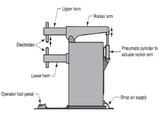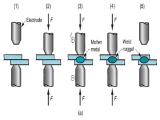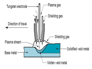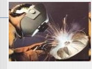 This document provides information on various welding processes and techniques. It begins by defining welding as joining metals through heat, pressure, or both. It then lists and describes common welding types including arc welding, oxyfuel gas welding, and resistance welding. The document focuses on explaining different arc welding processes such as shielded metal arc welding, submerged arc welding, flux-cored arc welding, gas metal arc welding, gas tungsten arc welding, plasma arc welding, and carbon arc welding. It also provides brief descriptions of oxyfuel gas welding and resistance welding.