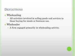 The document discusses different types of wholesalers including merchant wholesalers, brokers and agents, and manufacturers' and retailers' branches. It defines wholesaling and wholesalers. Merchant wholesalers are divided into full-service wholesalers and limited-service wholesalers. Limited-service wholesalers include cash-and-carry wholesalers, truck wholesalers, drop shippers, rack jobbers, producers' cooperatives, and mail-order wholesalers. The document also discusses brokers and agents as well as manufacturers' and retailers' branches.