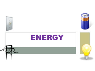 The document discusses different types of energy including electrical, mains electricity, heat, light, sound, and movement energy. It notes that many appliances in homes are powered by mains electricity which provides electrical energy that is then converted into other forms of energy. Examples are also given of appliances that use battery power and convert the electrical energy from batteries into heat, light, sound, or movement energy.