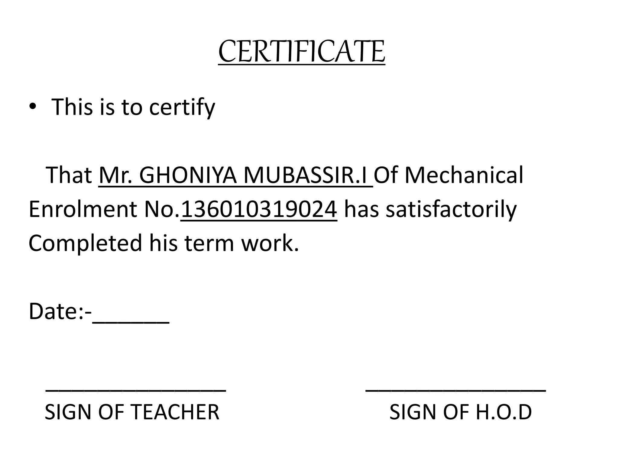 Mr. Ghoniya Mubassir completed his term work and this certificate verifies satisfactory completion. The document then discusses flexible manufacturing systems (FMS), which allow flexibility to adapt to changes. It describes five common FMS layout types: progressive/line type, loop type, ladder type, open field type, and robot centered type. Each layout type has different characteristics regarding part flow and flexibility. Applications of FMS include machining, forming, assembly, joining, surface treatment, inspection, and testing. Advantages are economic and productivity benefits while disadvantages include limited adaptability and technical challenges.