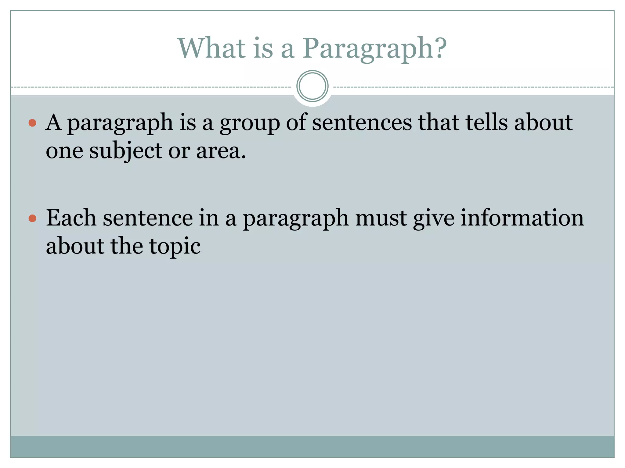 The document provides information on what paragraphs are and how to write them. It defines a paragraph as a group of sentences about one subject. Paragraphs can be used to describe something, tell a story, explain something, or persuade. The key parts of a paragraph are the topic sentence, supporting details, and closing statement. Examples are given of topic sentences and how to organize details to support them. Different types of paragraphs like descriptive, narrative, instructions, and compare/contrast are also outlined.