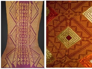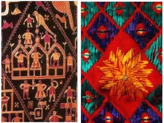 This document describes the different types and styles of Phulkari embroidery from Punjab, categorized by region, design, and motifs. Phulkari can be distinguished based on whether it uses scattered motifs or fully covered "Bagh" designs. Eastern Punjab is known for Bagh styles using motifs repeated to cover the entire shawl, often in red, orange, or brown, whereas western Punjab features scattered motifs combined with other techniques like mirror work in brighter colors. The document outlines many specific Phulkari styles defined by their motifs, patterns, sizes, colors, and regional origins within Punjab.