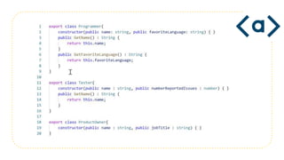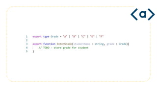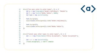 This document discusses advanced TypeScript concepts beyond the basics, including data types, generics, inheritance, composition vs inheritance, intersection types, union types, string literals, and using TypeScript's type system to clearly express software intent. It is presented by Eric Potter and assumes familiarity with adding types to variables, parameters, classes, and using type definition files and build configuration.