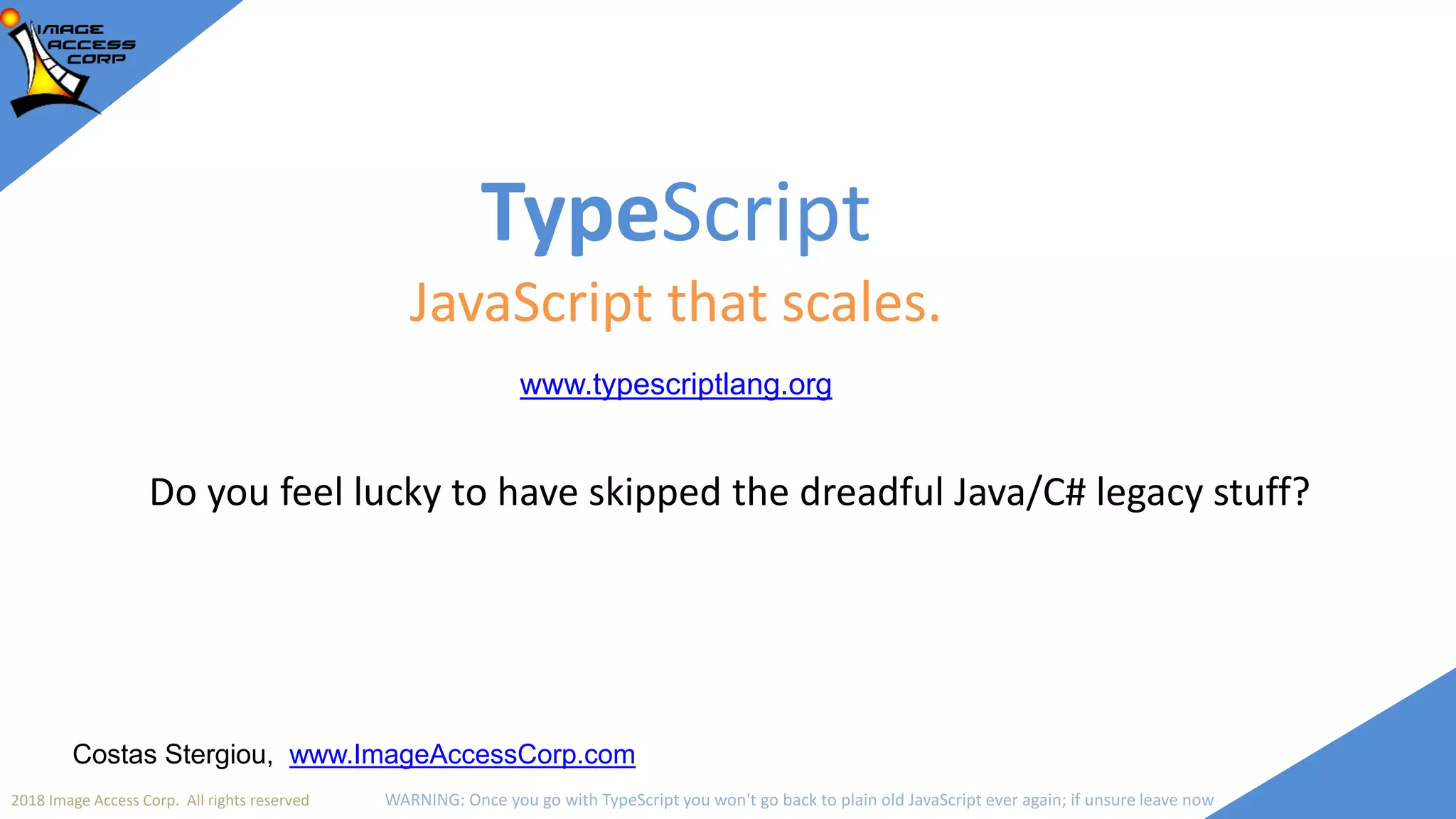 The document discusses the transition from Java and JavaScript to TypeScript for developing scalable and maintainable applications in a browser environment. It highlights TypeScript's advantages, such as error detection, improved developer productivity, and structured code organization, which address the challenges faced with traditional JavaScript. The document concludes by emphasizing TypeScript's ability to enhance code quality and development efficiency.