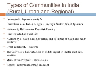 This document discusses different types of communities in India, including rural, urban, and regional communities. It provides details on the features and characteristics of village communities, including community consciousness, the joint family system, and simplicity. It also describes the panchayat system of local self-governance in villages and changes occurring in rural Indian life. The document outlines the goals and programs of community development projects and discusses the availability and impact of health facilities in rural areas.