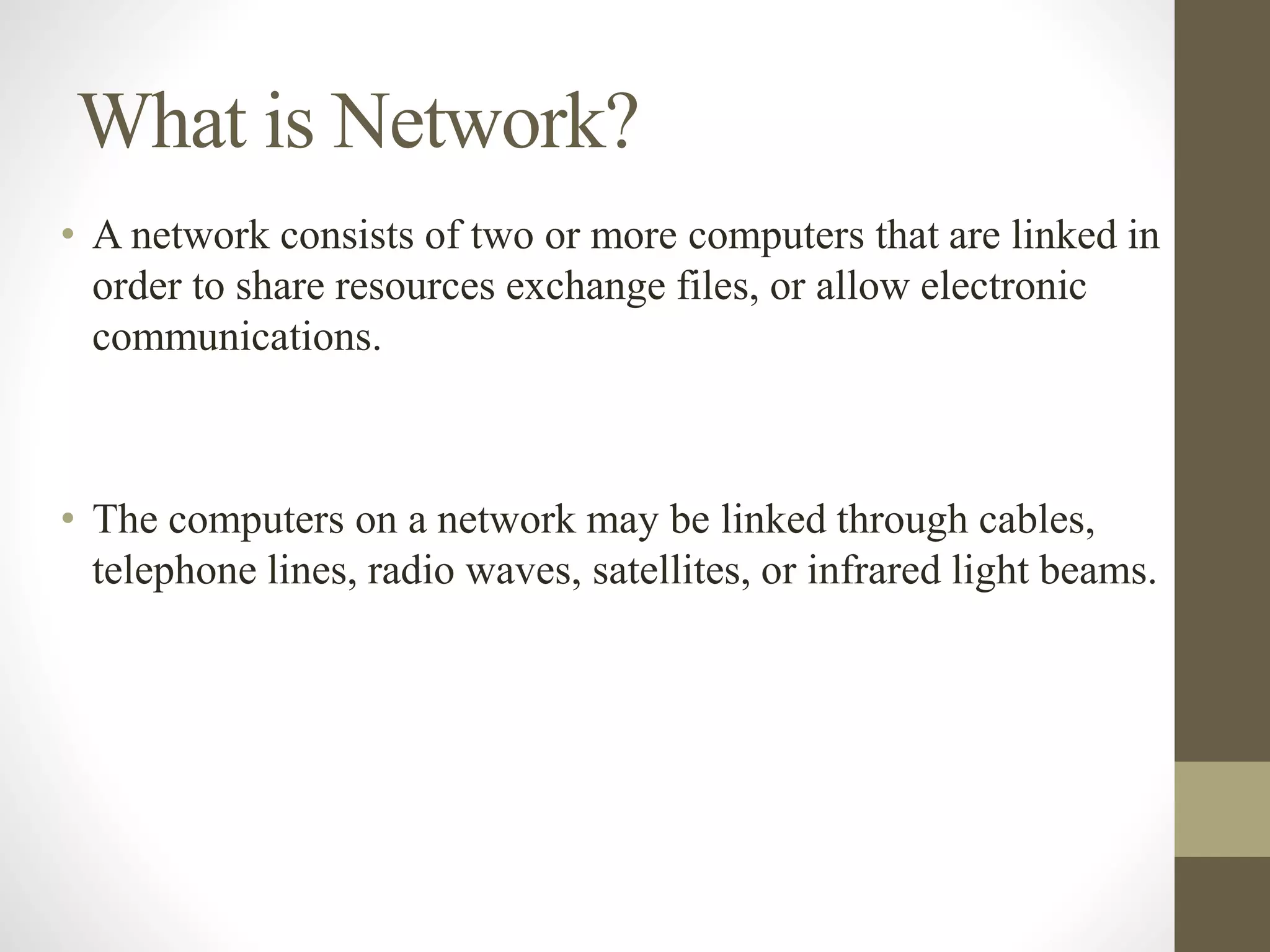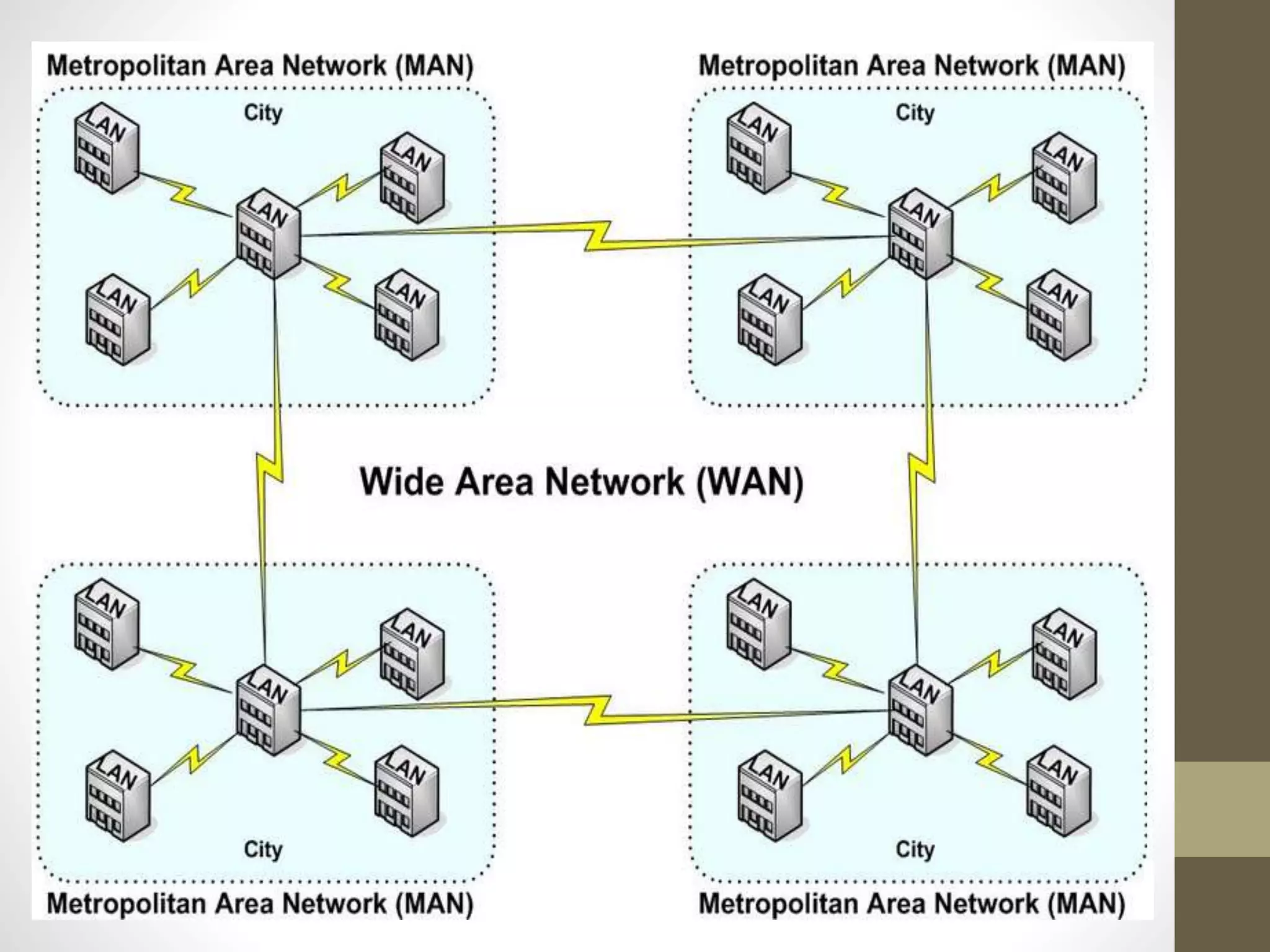 This document defines and describes different types of computer networks. It discusses local area networks (LANs) that connect devices within a building using cables or wirelessly, metropolitan area networks (MANs) that span a larger area like a city using technologies like DSL, and wide area networks (WANs) that connect LANs over long distances using technologies like fiber optics or satellites. It also covers personal area networks (PANs) used to connect devices in close proximity, within a few meters of an individual.