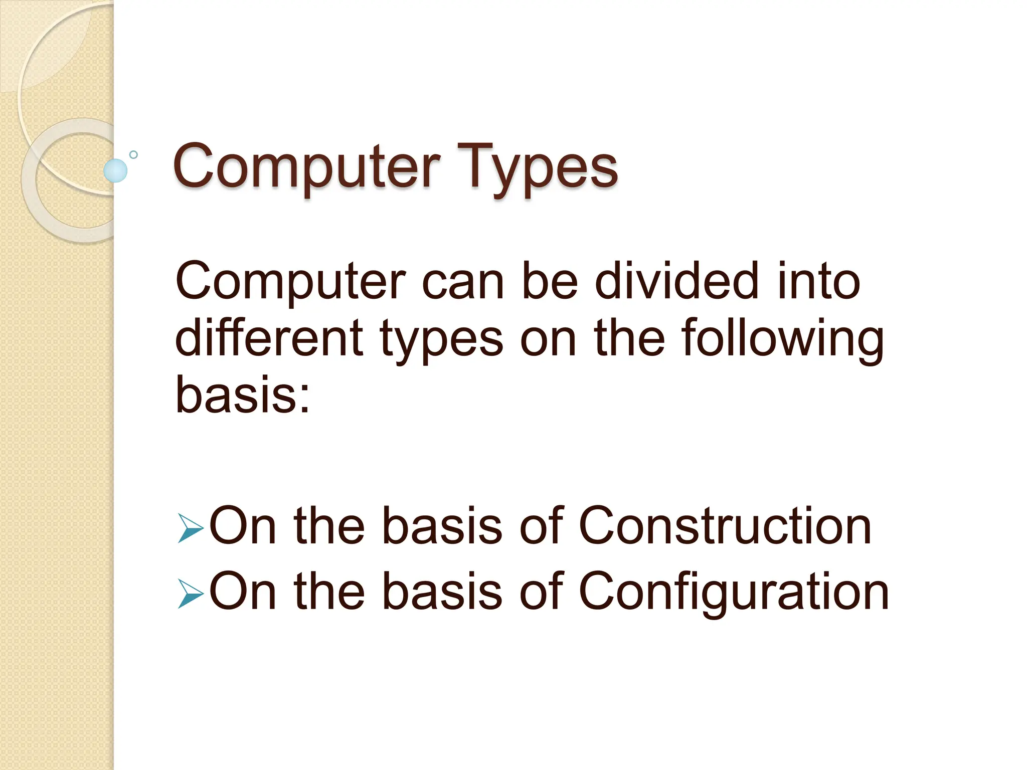 The document discusses different types of computers based on their construction and configuration. In terms of construction, computers can be analog, digital, or hybrid. Key factors that define analog computers are their ability to measure continuous values and use of operational amplifiers. Digital computers are designed to perform daily tasks and use integrated circuits. Hybrid computers have characteristics of both analog and digital. In terms of configuration, computers include microcomputers (personal computers), laptops, palmtops, mainframes, minicomputers, and supercomputers. Each type varies in size, components, processing power, and common uses.