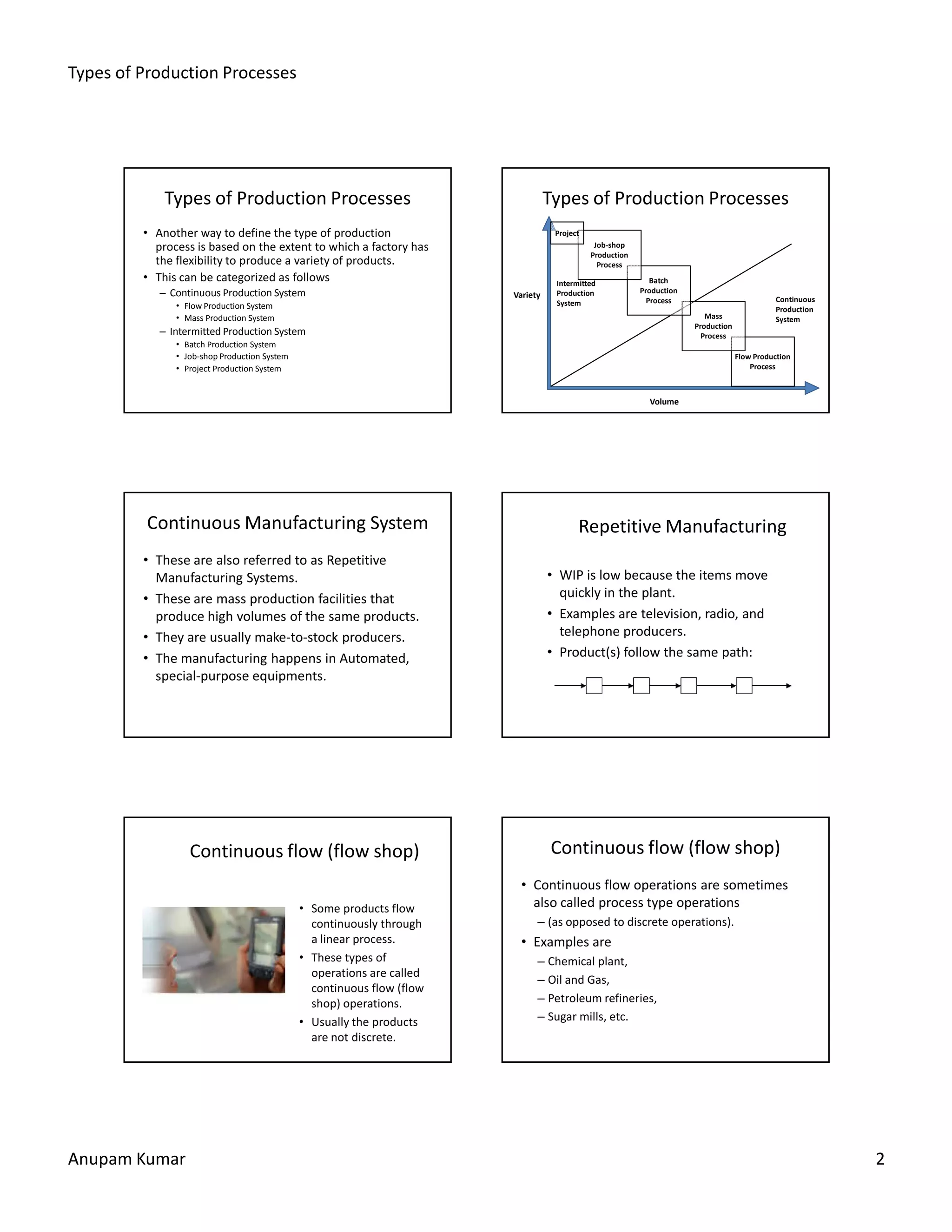 1. Production processes are classified based on product variety and volume into continuous processes like flow production and mass production, and intermittent processes like batch production and job shop production.