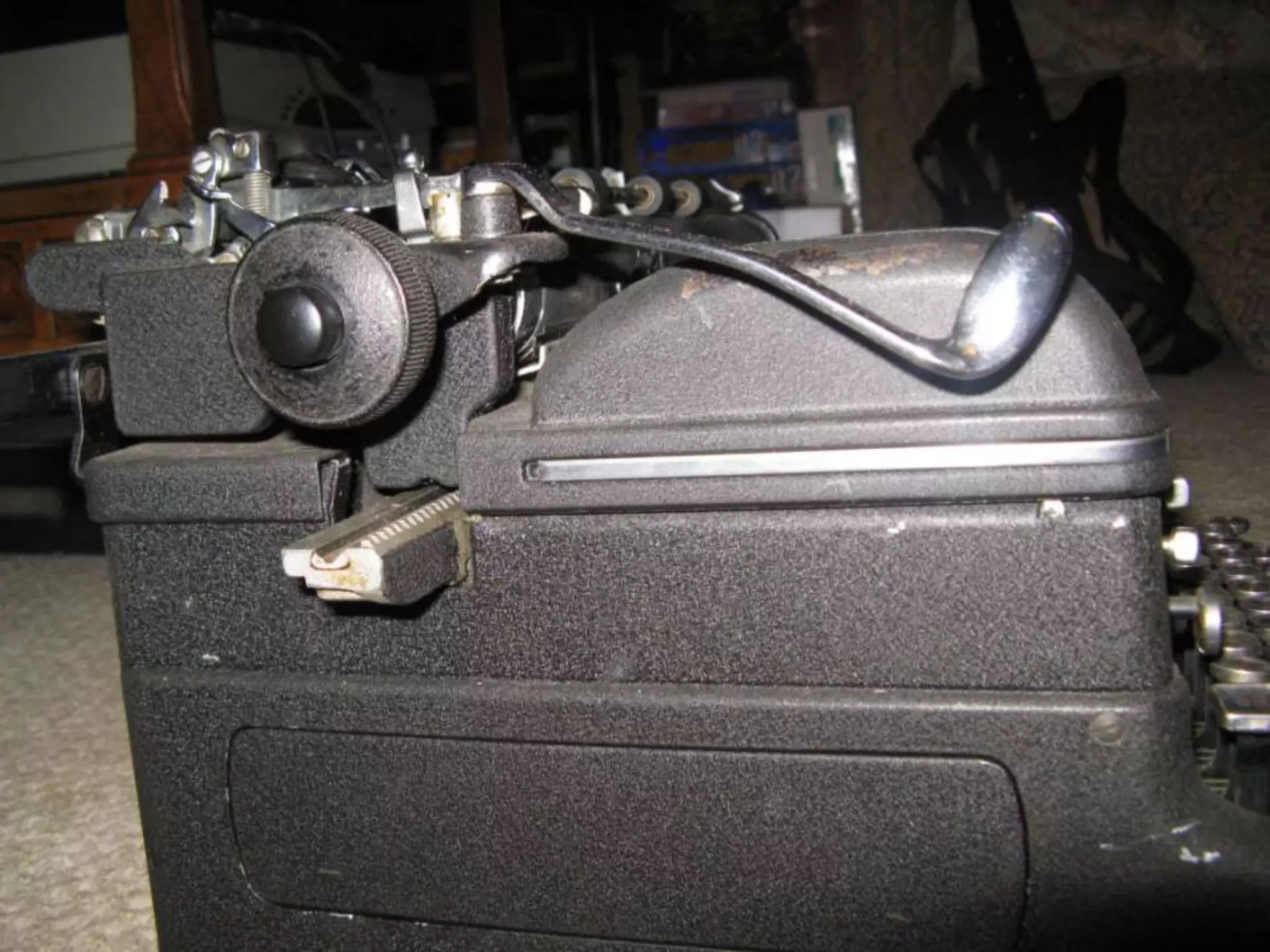 The typewriter was found in a trash bag and had several broken and bent pieces, including part of the carriage on the left side being bent out of place, the magic margin tab and switch on the left side being missing or immovable, the ribbon spools being badly bent, and a loose piece on the underside of the left side. The condition and damage of the typewriter is documented through several close-up photographs showing the specific problems.