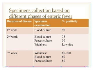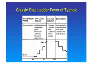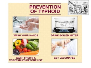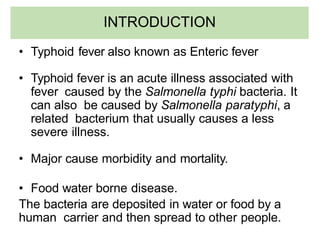 Typhoid fever is caused by infection from the Salmonella typhi bacteria. It is spread through contaminated food or water. Symptoms include a sustained fever, abdominal pain, and headache. Without treatment, some patients may develop severe complications like intestinal bleeding or perforation. Diagnosis involves blood or stool cultures. Treatment is with antibiotics like fluoroquinolones for 2 weeks. A small percentage of patients become chronic carriers even after treatment.