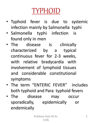 This document summarizes typhoid fever, caused by Salmonella typhi bacteria. It discusses the epidemiology, transmission, clinical features, diagnosis and control of the disease. Typhoid fever is transmitted through contaminated food, water or contact with carriers. It causes sustained fever for 2-3 weeks and can lead to serious complications without treatment. Diagnosis involves blood and stool cultures. Control relies on identifying carriers, improving sanitation, safe food/water handling, and immunization with Vi polysaccharide or live attenuated Ty21a vaccines.