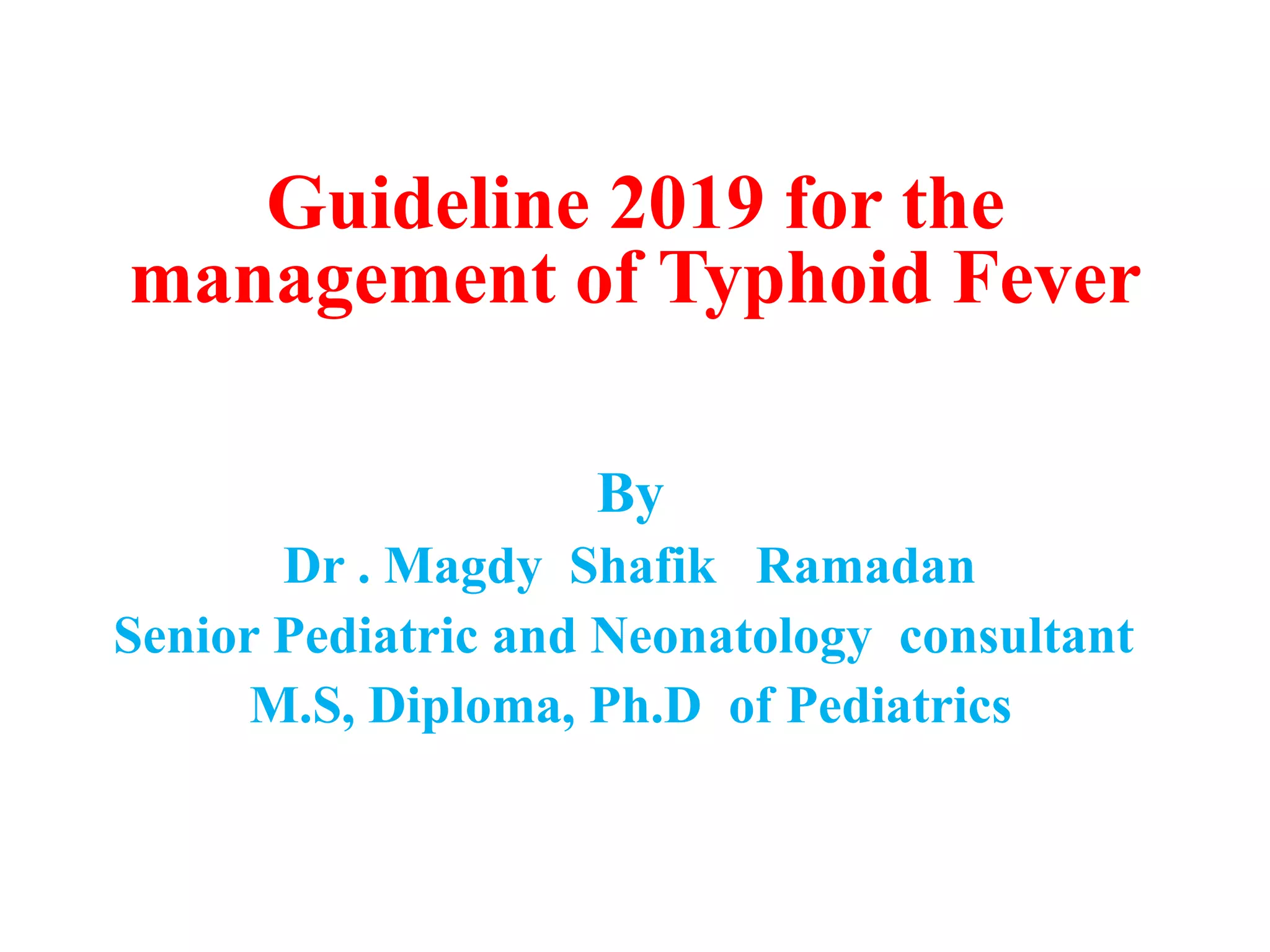 Typhoid fever is a systemic infection caused by Salmonella typhi bacteria. It remains a significant public health problem globally, especially in developing countries in Asia and Africa. The disease is transmitted through ingestion of food or water contaminated by the feces or urine of infected humans. Laboratory diagnosis can be made through blood cultures early in the infection or the Widal test which detects antibodies in the blood. Treatment involves antibiotic therapy but multidrug resistant strains have emerged, complicating treatment.