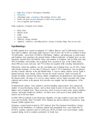 Typhoid fever is caused by the bacterium Salmonella typhi. It spreads through contaminated food, water, or close contact with infected carriers. Symptoms include sustained high fever, headaches, abdominal pain and constipation or diarrhea. It is diagnosed through blood or stool cultures and treated with antibiotics, though some chronic carriers still exist. Proper sanitation, hygiene and water treatment are crucial to prevent the spread of typhoid.