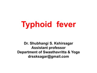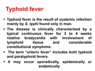 Typhoid fever is a systemic infection primarily caused by Salmonella typhi, characterized by prolonged fever, gastrointestinal symptoms, and potential complications such as intestinal hemorrhage. The disease spreads via the fecal-oral route, with humans as the sole reservoir of infection, and is particularly prevalent among individuals aged 5 to 19. Control measures include sanitation improvements, vaccination, and the treatment of infected individuals and carriers.