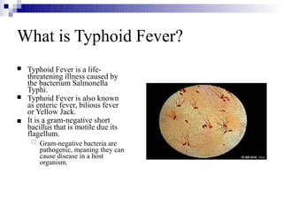 Typhoid fever is a life-threatening illness caused by the Salmonella Typhi bacterium. It affects the intestines and bloodstream and symptoms include sustained high fever, abdominal pain, and diarrhea. The disease is contracted through ingestion of food or water contaminated by the feces of infected individuals. While antibiotics can effectively treat the infection, multidrug-resistant strains are emerging. Prevention relies on vaccination, safe food and water practices, and hygiene.