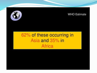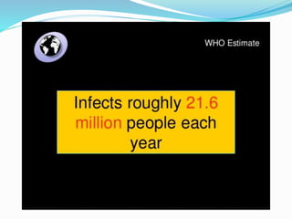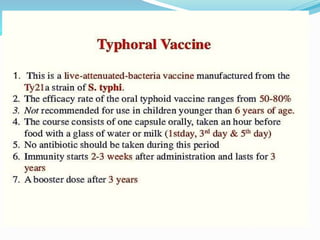 Typhoid fever is caused by the Salmonella Typhi bacteria. It is transmitted through contaminated food or water. Symptoms include sustained high fever, weakness, abdominal pain, and headaches. Diagnosis involves blood, stool, or urine cultures. Treatment consists of antibiotics like chloramphenicol or ciprofloxacin for 10-14 days along with rest and proper nutrition. Prevention relies on proper sanitation, hygiene, and vaccination.