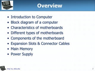 The document provides an overview of the typical configuration of a computer system. It describes the basic components of a computer including the input unit, central processing unit (CPU), memory unit, and output unit. The CPU consists of a control unit and arithmetic logic unit (ALU). The document then focuses on the motherboard, which contains the CPU, memory, expansion slots, and other electronic components. It discusses the characteristics, types, and components of motherboards such as the processor, BIOS, slots, disk controllers, ports, and power supply.