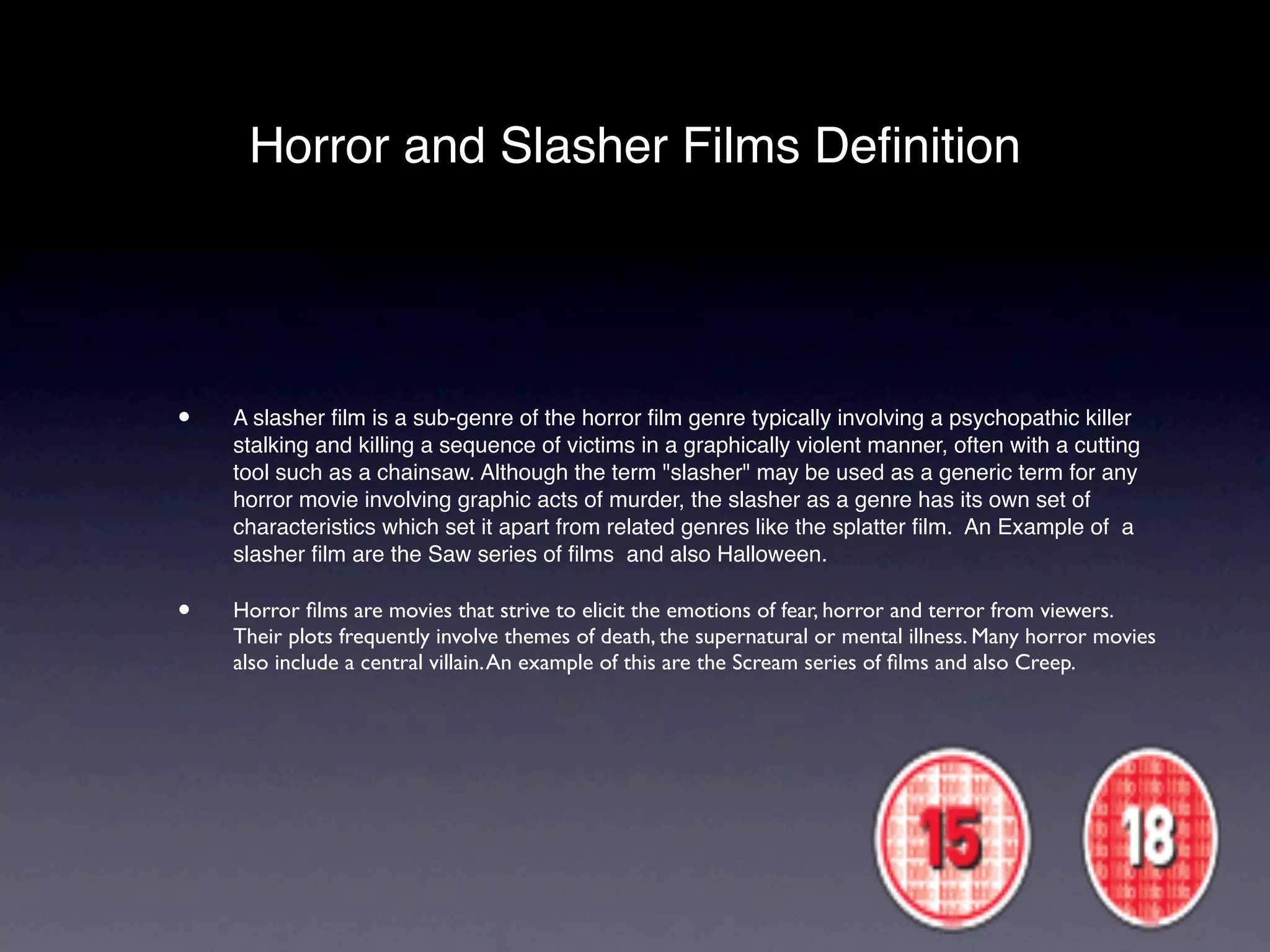 The document provides an analysis of elements commonly found in horror and slasher films. It discusses characteristics of these genres, including the presence of a psychopathic killer and themes of death. Examples are given of classic films like Halloween and Scream. Elements of mise-en-scene analyzed include lighting, camera work, costumes, and characters. Darkness, close-ups, and ordinary clothing are discussed as being used to portray danger, focus on expressions, and imply innocence respectively. The document examines how these visual elements set the tone and provide clues to the audience about the genre and plot.