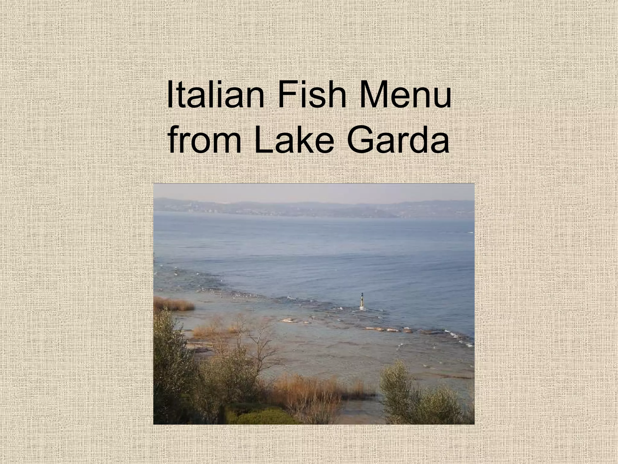 This document provides an Italian fish menu from Lake Garda including appetizers of herrings and olives, first courses of risotto with tench and stuffed pasta, second courses of fried fish and whitefish with vegetables, and desserts of lemon sorbet and almond cookies. Dishes are accompanied by descriptions of ingredients and preparation methods.