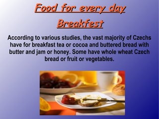 Traditional Czech breakfasts consist of tea or cocoa with buttered bread and jam or honey. Lunches vary but often include dishes like pork and cabbage dumplings served in school canteens. For dinner, families may have lighter meals together or go out to restaurants, while regular dinners include items like bread, salami, vegetables and cheese. Special holiday foods include spinach dumplings on Green Thursday, lentil soup on Good Friday, and roast goose or duck with cabbage on Easter Sunday. Christmas Eve meals don't include meat, and Christmas features fried carp and steak with potato salad.