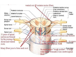 The document summarizes the structure and organization of typical spinal nerves. It discusses how spinal nerves are formed from the dorsal and ventral roots, containing both sensory and motor fibers. Each spinal nerve exits the vertebral column through an intervertebral foramen, forming 31 pairs of spinal nerves that innervate different regions of the body. The anterior and posterior primary branches of spinal nerves further branch to supply specific regions like the skin and muscles of the back and body wall.